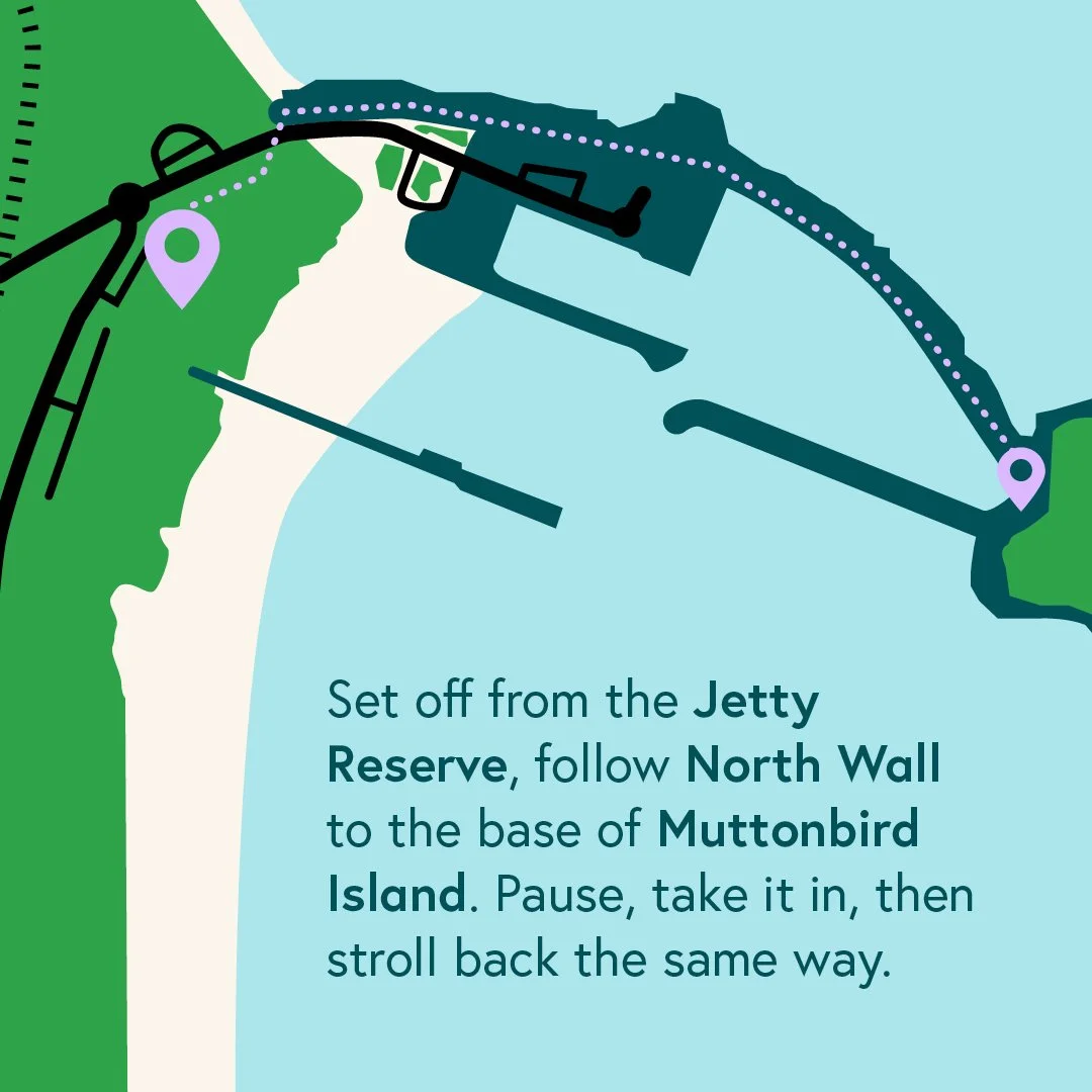 We kick off with music, coffee, and bacon & egg rolls, then set off from the Jetty Reserve, along the North Wall to the base of Muttonbird Island, pause to take it in, and stroll back together. Step by step. Side by side.